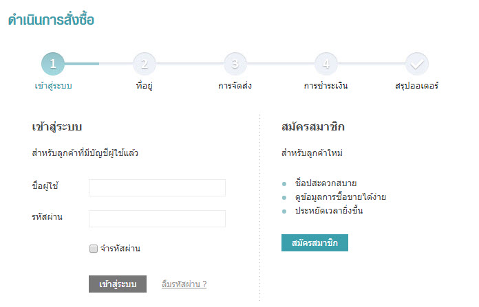 3. ในกรณีที่กดปุ่ม ชำระเงิน ระบบจะนำท่านเข้าสู่หน้า เข้าสู่ระบบ ซึ่งสามารถกรอกชื่อผู้ใช้และรหัสผ่านสำหรับท่านที่เป็นสมาชิกแล้ว หรือ สมัครสมาชิกใหม่ หรือ เลือกสั่งซื้อสินค้าโดยไม่สมัครสมาชิก