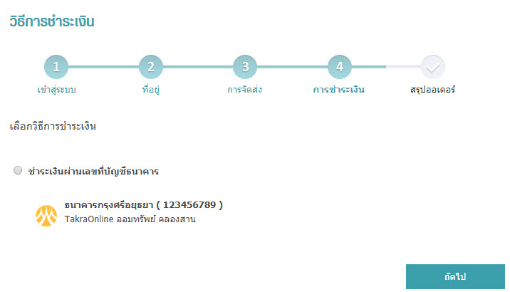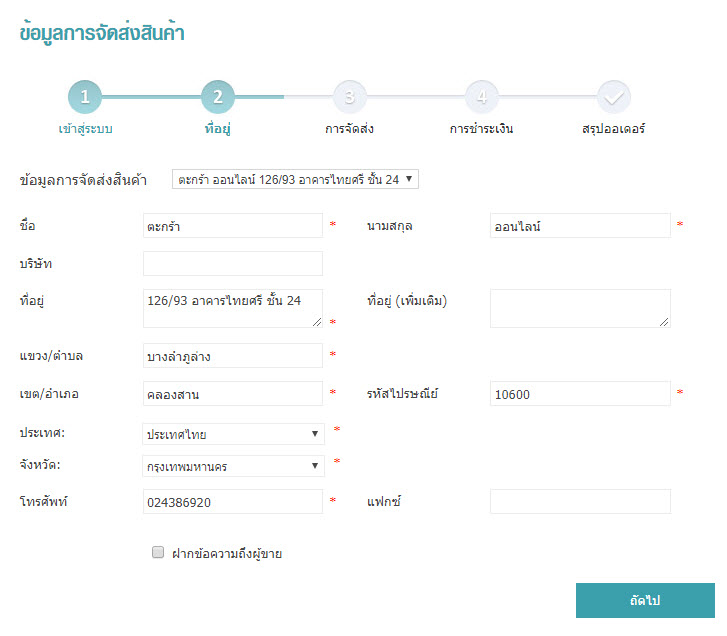 4. หากท่านเข้าสู่ระบบโดยใช้รหัสผู้ใช้งาน หรือสั่งซื้อโดยไม่สมัครสมาชิก ระบบจะแสดงข้อมูลการจัดส่งสินค้า ให้ท่านกรอกชื่อที่อยู่สำหรับติดต่อ และ ชื่อที่อยู่สำหรับจัดส่ง จากนั้นกด ถัดไป